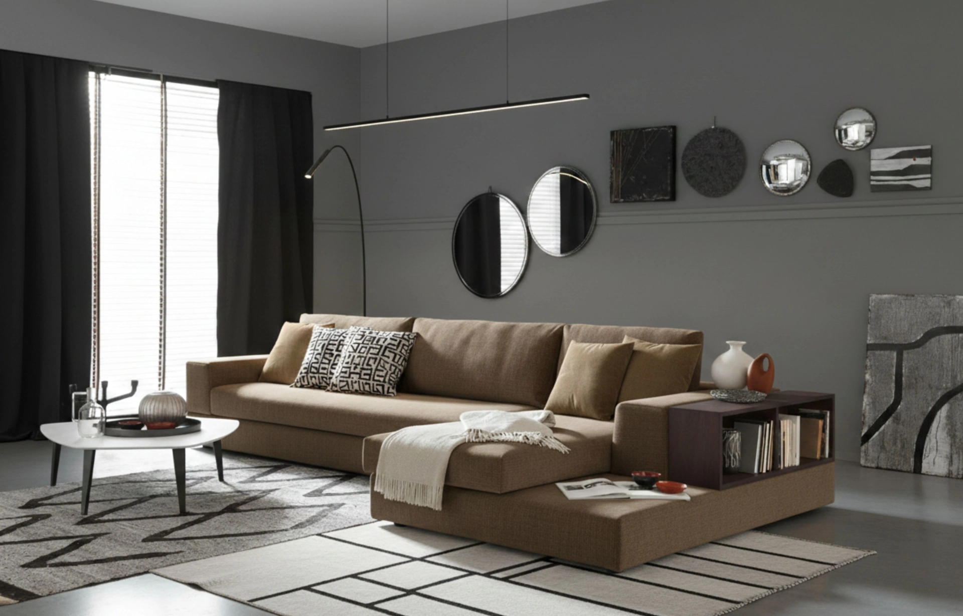 AURA to imponująca konapa narożna o szerokości 340 cm, składająca się z wygodnej otomany, przestronnego modułu głównego oraz szerokich podłokietników. Absolutnym wyróżnikiem tego modelu jest wbudowany w bok półko-barek - idealne miejsce na książki, dekoracje lub filiżankę kawy. To rozwiązanie nie tylko przyciąga wzrok swoim stylem, ale jest niezwykle praktyczne w codziennym użytkowaniu.